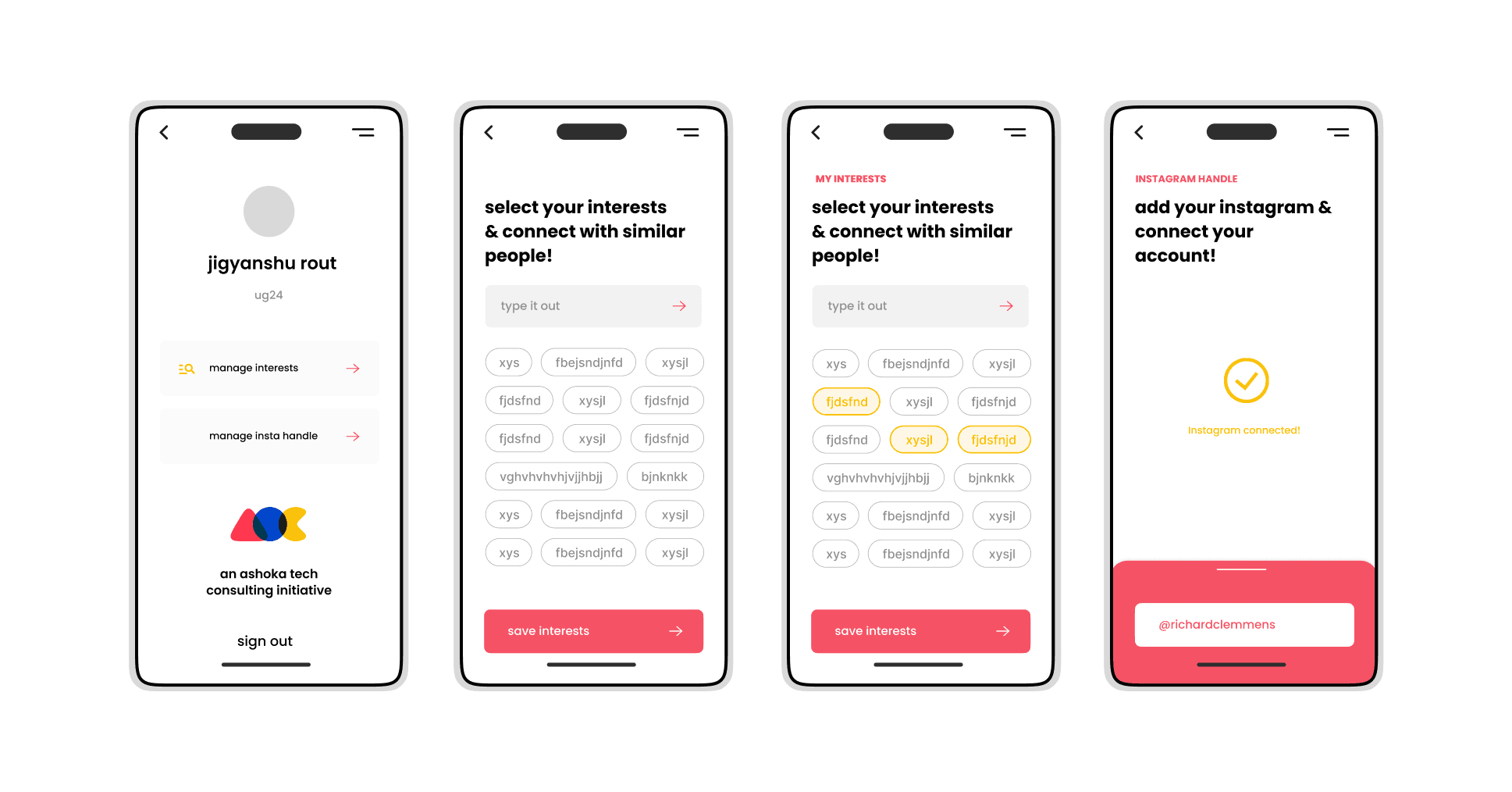Before using Find My Pal, students create a lightweight profile, name, batch, interests, and an optional Instagram.
