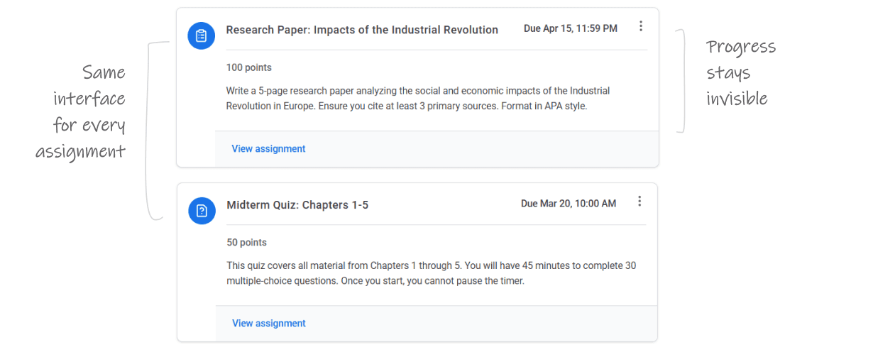 Students struggle to start, pace their work, and know if they’re on track until it’s too late. What looks like procrastination is often a planning and feedback problem: the way the work unfolds doesn’t match how Classroom represents it.