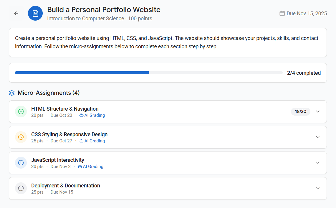 Students see one micro-assignment at a time, turning a large assignment into smaller, self-contained tasks that keep attention on what to do next.