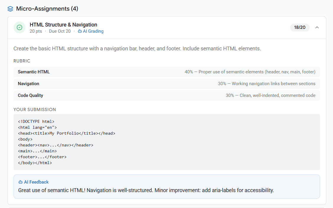 Each micro-assignment closes its own loop, students see the criteria, submit, and get feedback before the next step begins.