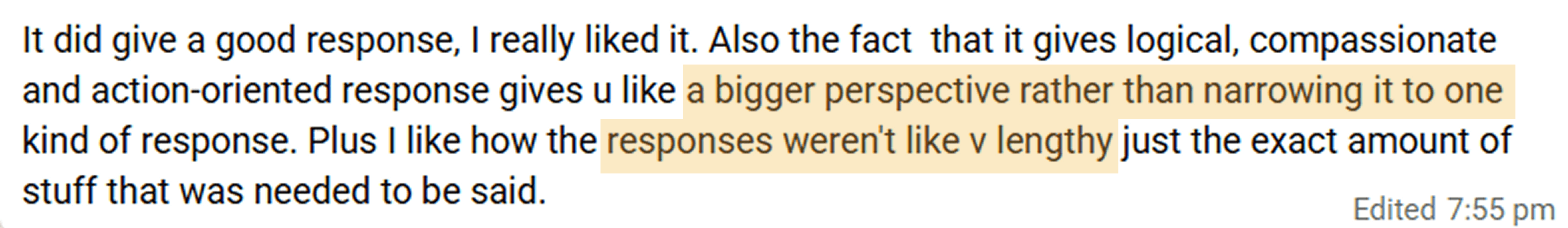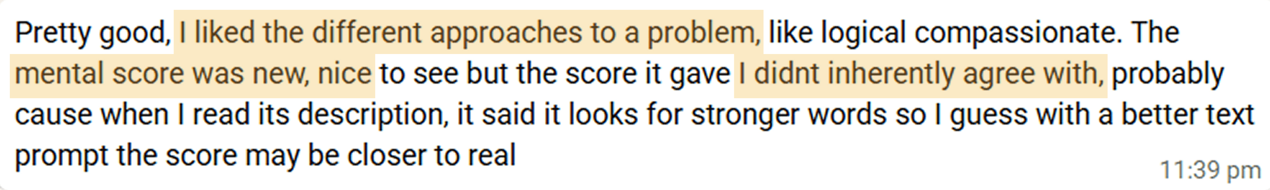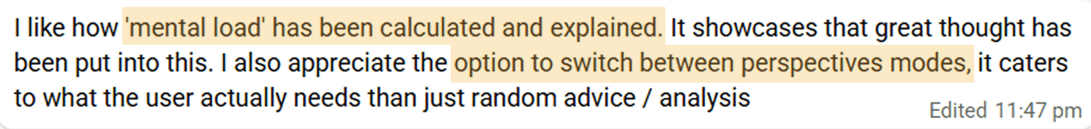 Most of the users said the reframes touched on both, the objective & subjective angles around the thoughts. Below are some feedback points I received.