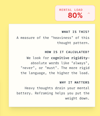 The tool detects the thought pattern and scores how rigid the thinking is before generating anything. That score shapes the tone, depth, and number of reframes the user sees.