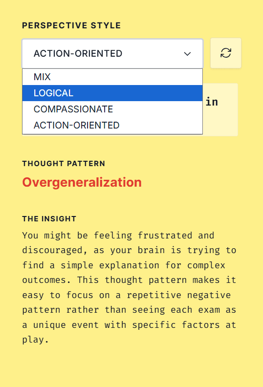 Most tools merge explanation and advice into one; Perspective Lab separates them, insight on the left (why you think this way), reframes on the right (how else to see it).