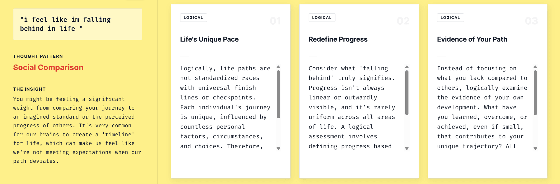 Three reframes, three angles on the same thought, never collapsed into one. The user sees all options and chooses what resonates.