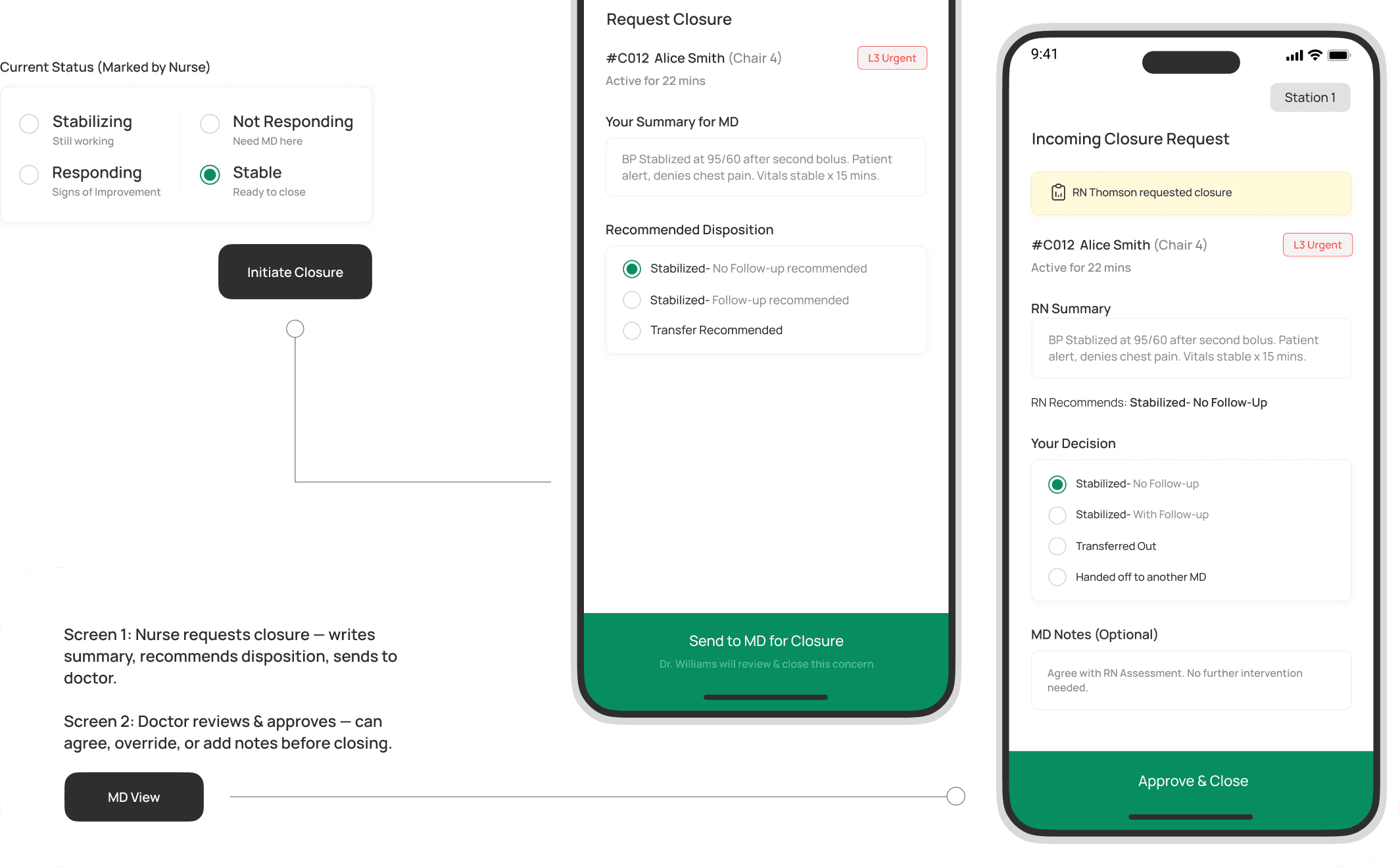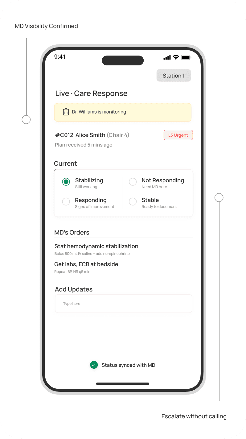 During an emergency, the nurse's hands are busy. A single status selector (Stabilizing → Responding → Not Responding → Stable) takes one tap. The doctor sees it instantly.