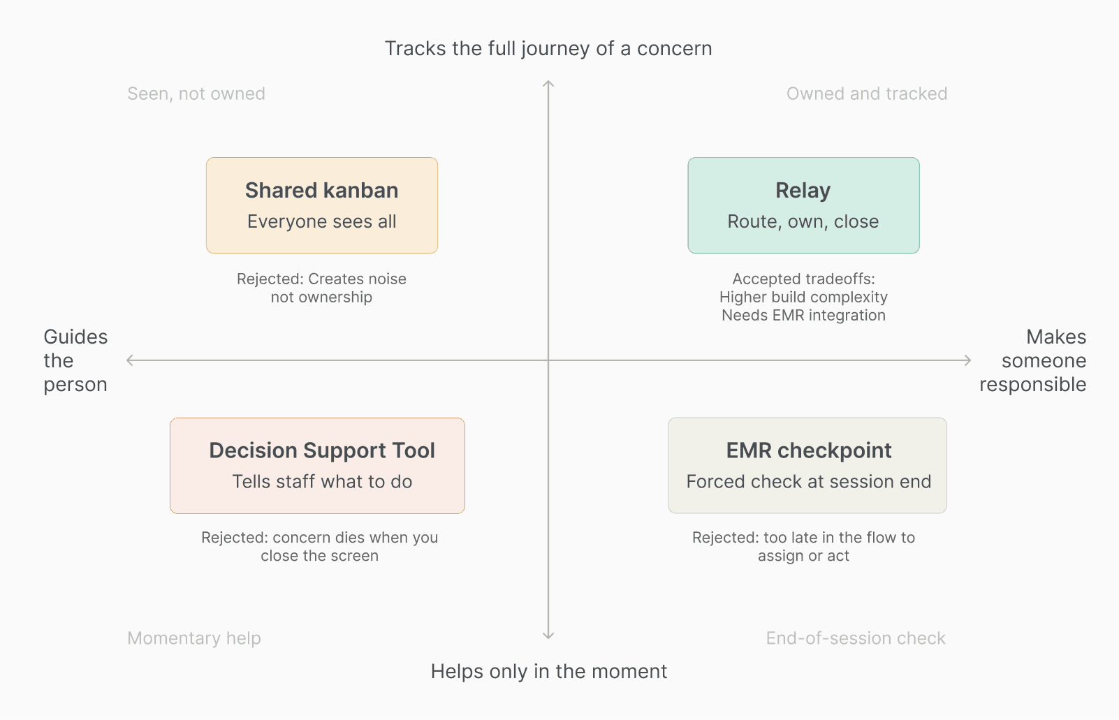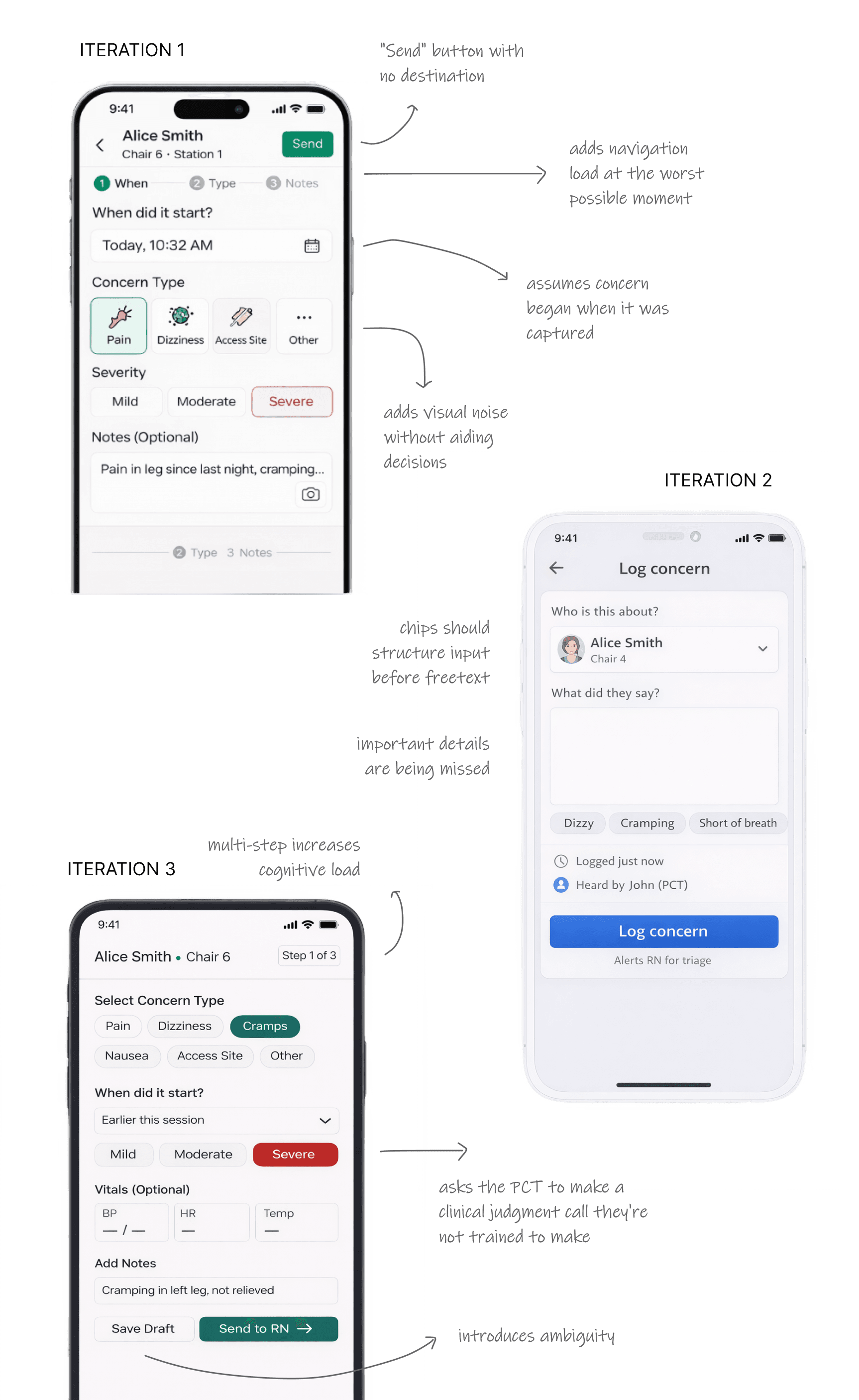 What: Designed Relay, a concern routing system for dialysis clinics. Captures patient concerns at bedside in under 10 seconds, routes them to the right clinician, and tracks each one to resolution.