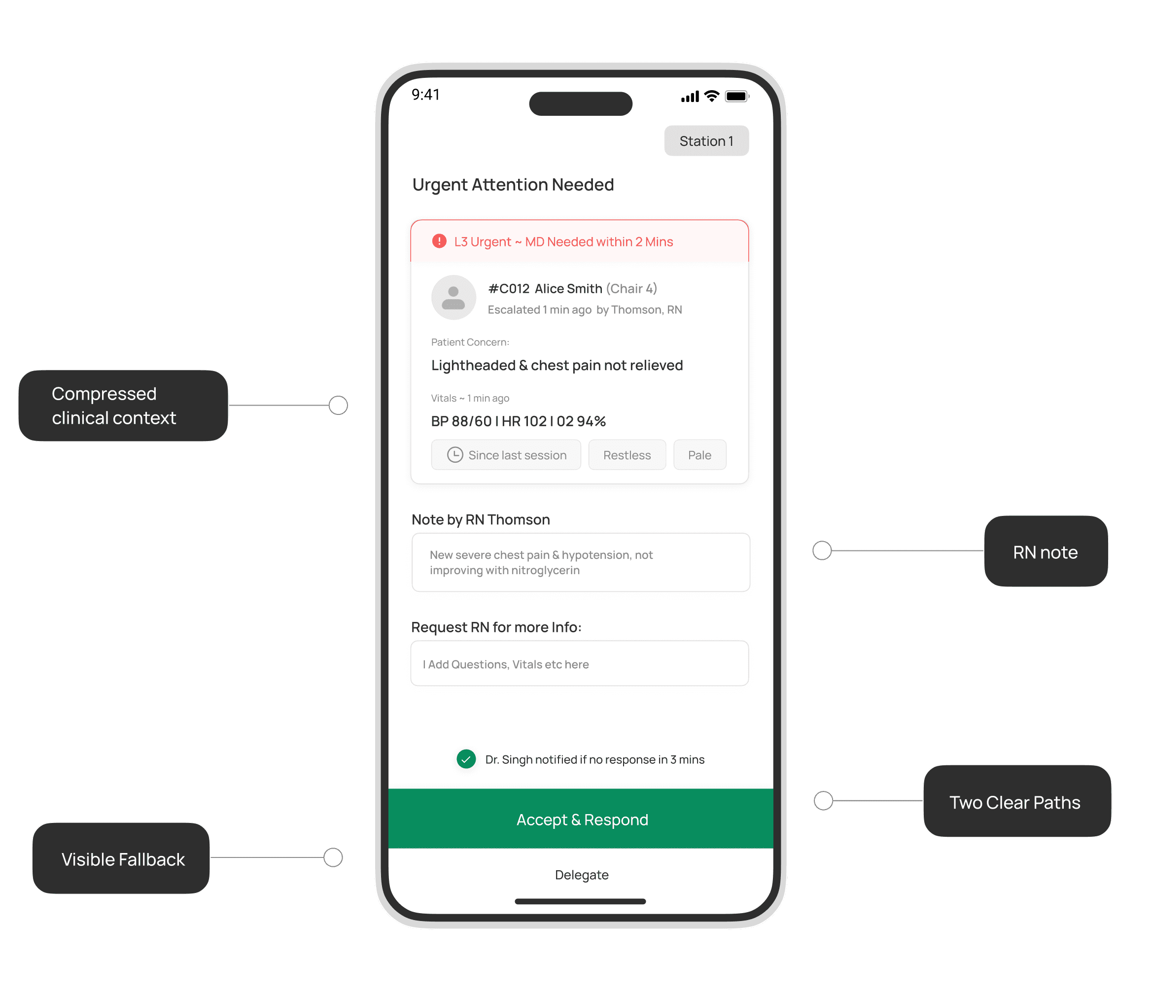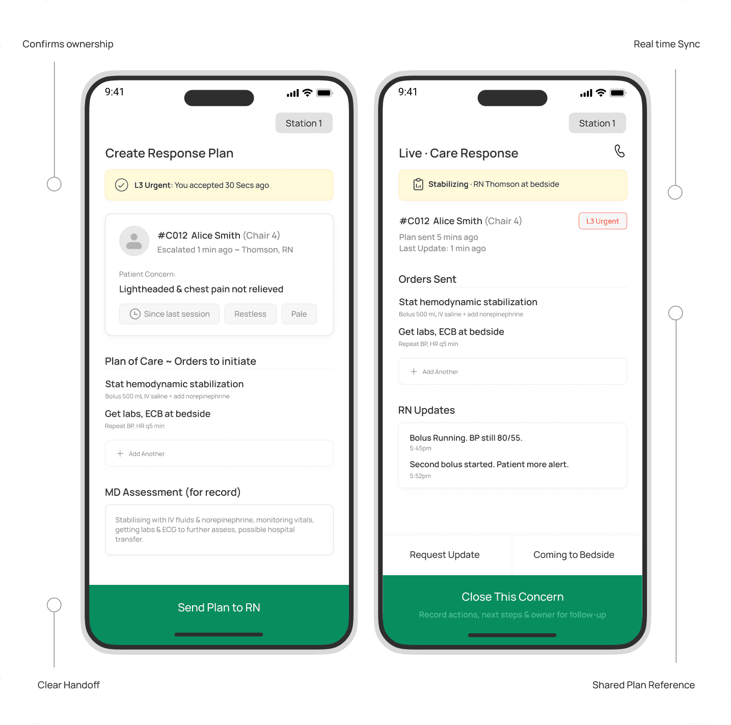 Doctors aren't at the bedside. They need context fast. The nurse's note enables a decision. If they can't act, ownership transfers automatically, no concern gets stuck.