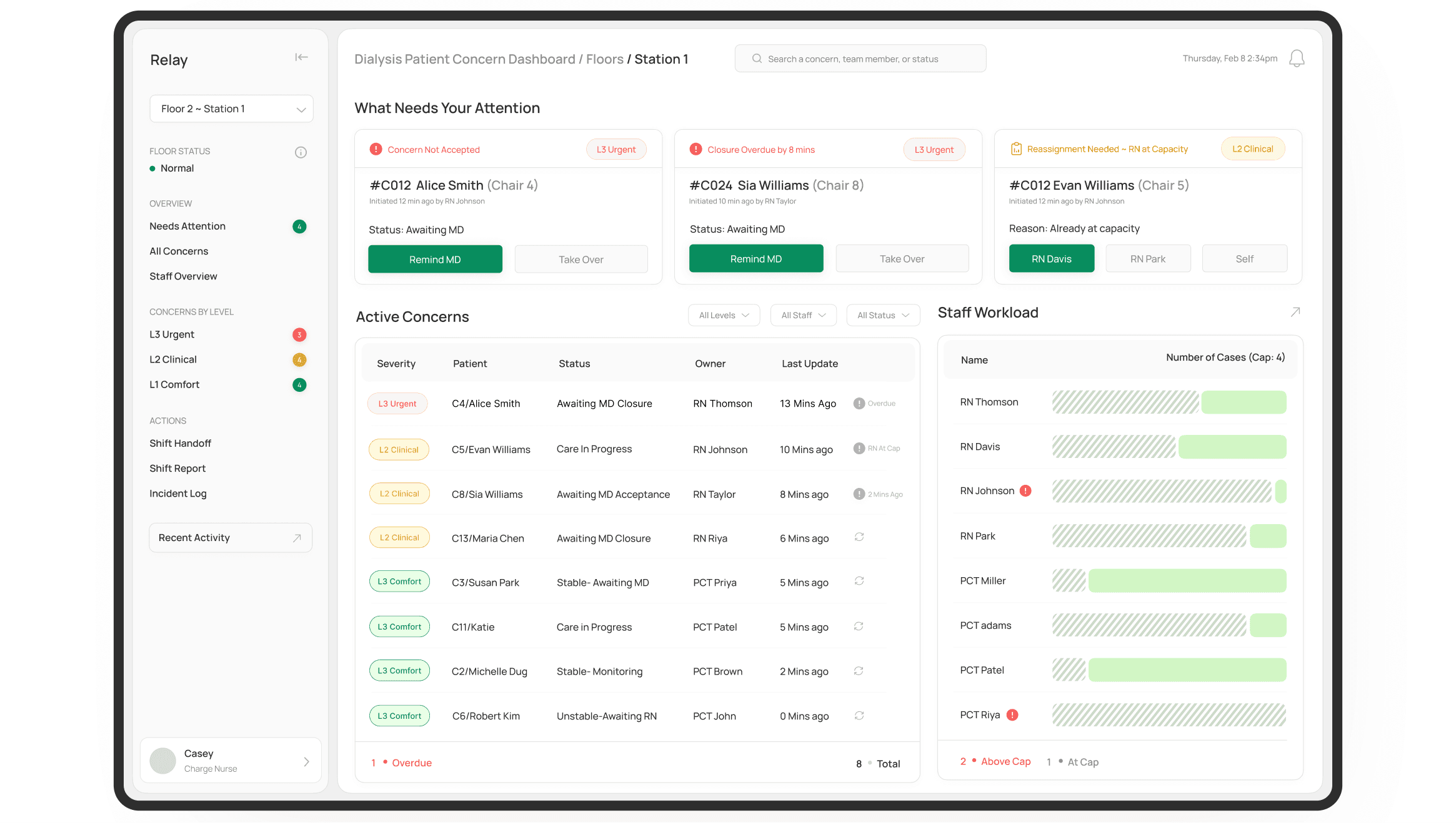 The charge nurse needed a real-time view of what was happening across her floor, concern status, ownership, documentation gaps, and escalation state at every station.