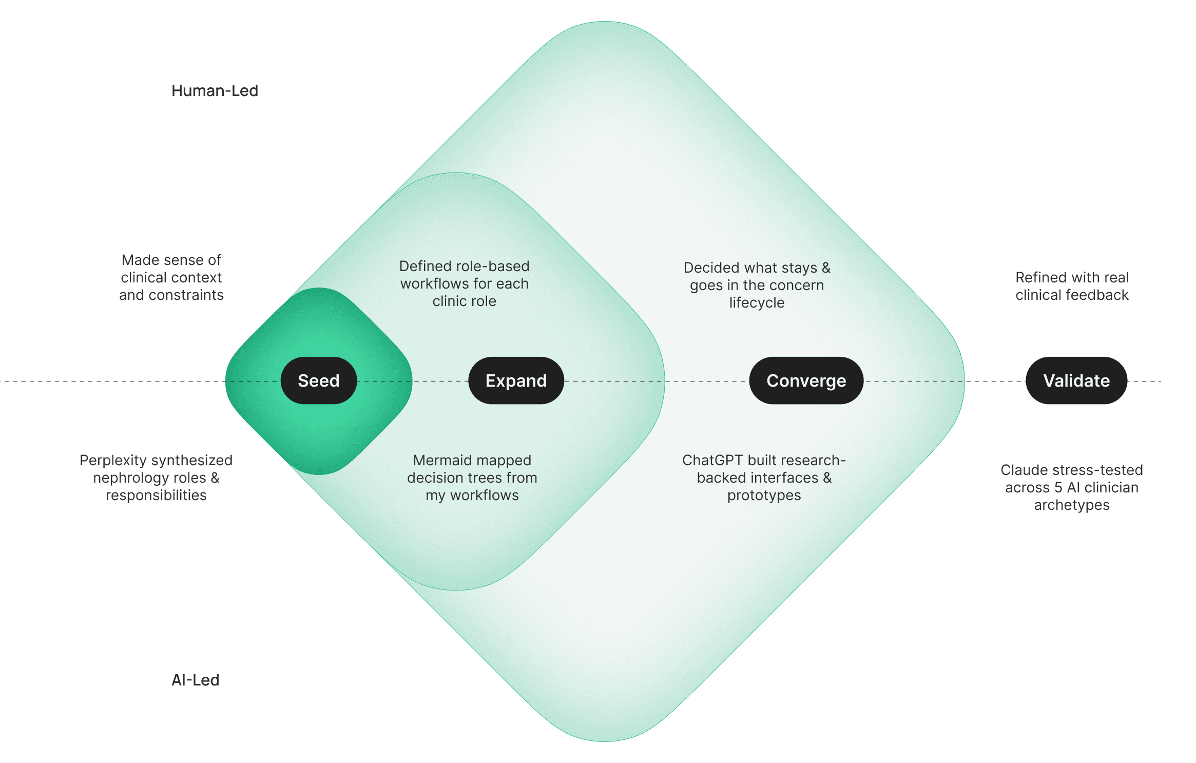 My AI-Augmented Design process has its roots in the classic double diamond. I front-loaded the process around understanding the clinic roles & context, and used AI to go deeper.